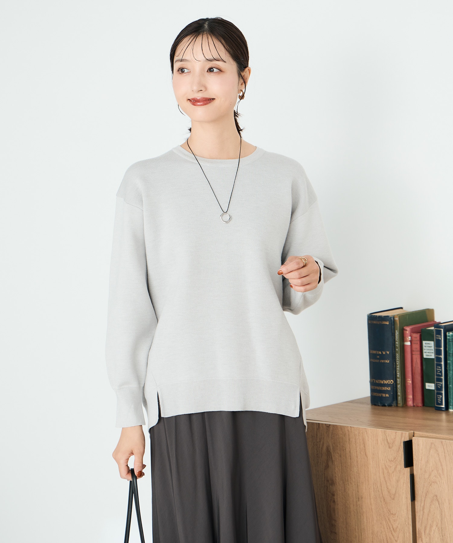 脇線を前にふったイレヘムデザインがアクセントになったスウェット見えニット