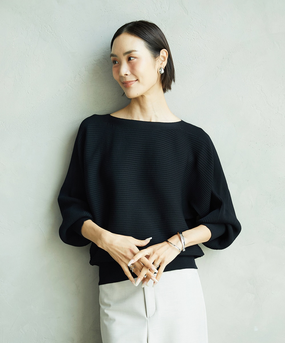 シンプルなリブデザインでコーディネートに取り入れやすく、 ボートネックの開きで抜け感が出て首や顔周りをスッキリと二の腕も気にならずに着用できます。