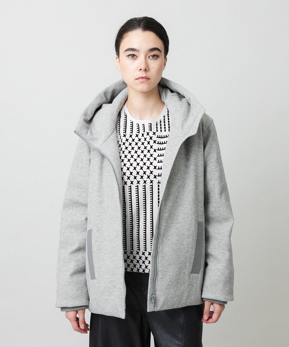 気軽にさっと羽織れる保温性抜群のジャケットです。表側はウールのような素材でカジュアル感を抑え、内側は薄いエコダウンをキルティングしているので見た目以上の暖かさがあります。ファスナーを全部閉めると高めのスタンドカラーで首元を暖かくカバーし、首をより細く見せます。袖口はリブで風を通さず保温性抜群です。