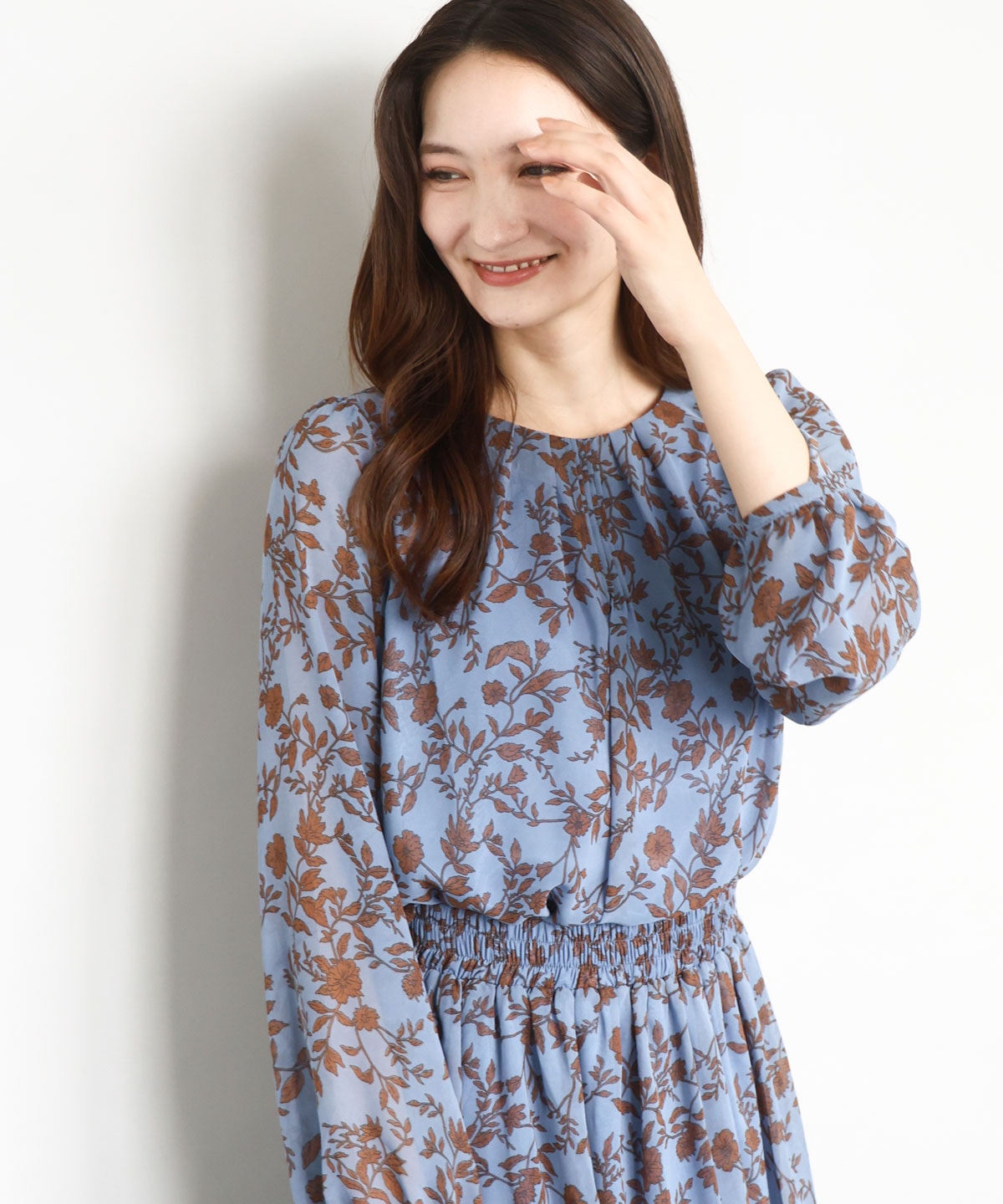 レトロな色合いの花柄が大人な印象のシフォンブラウス。存在感のあるプリントが引き立つようネックラインはすっきりと仕上げました。