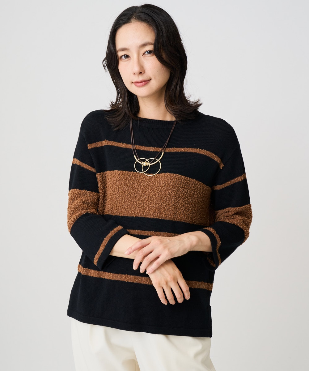 秋の始まりに一枚で着られてサマになるボーダーニット。