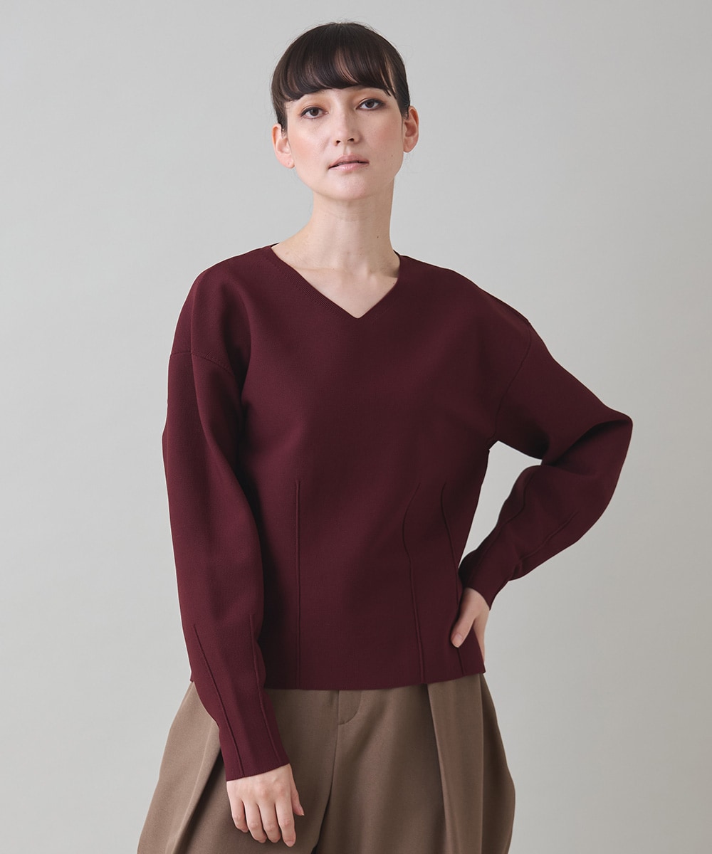 ポリエステル100%で軽やかな着心地の編み立てのダーツデザインのニットプルオーバーです。