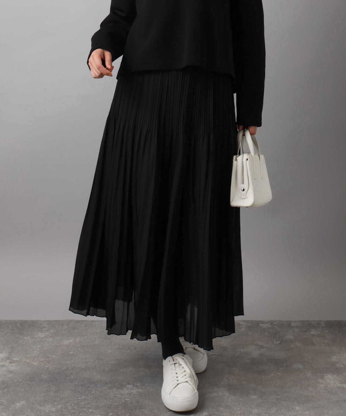 光沢感のあるブライトシアープリーツスカートは、上品な透け感と細かなプリーツが美しいアクセントに。
