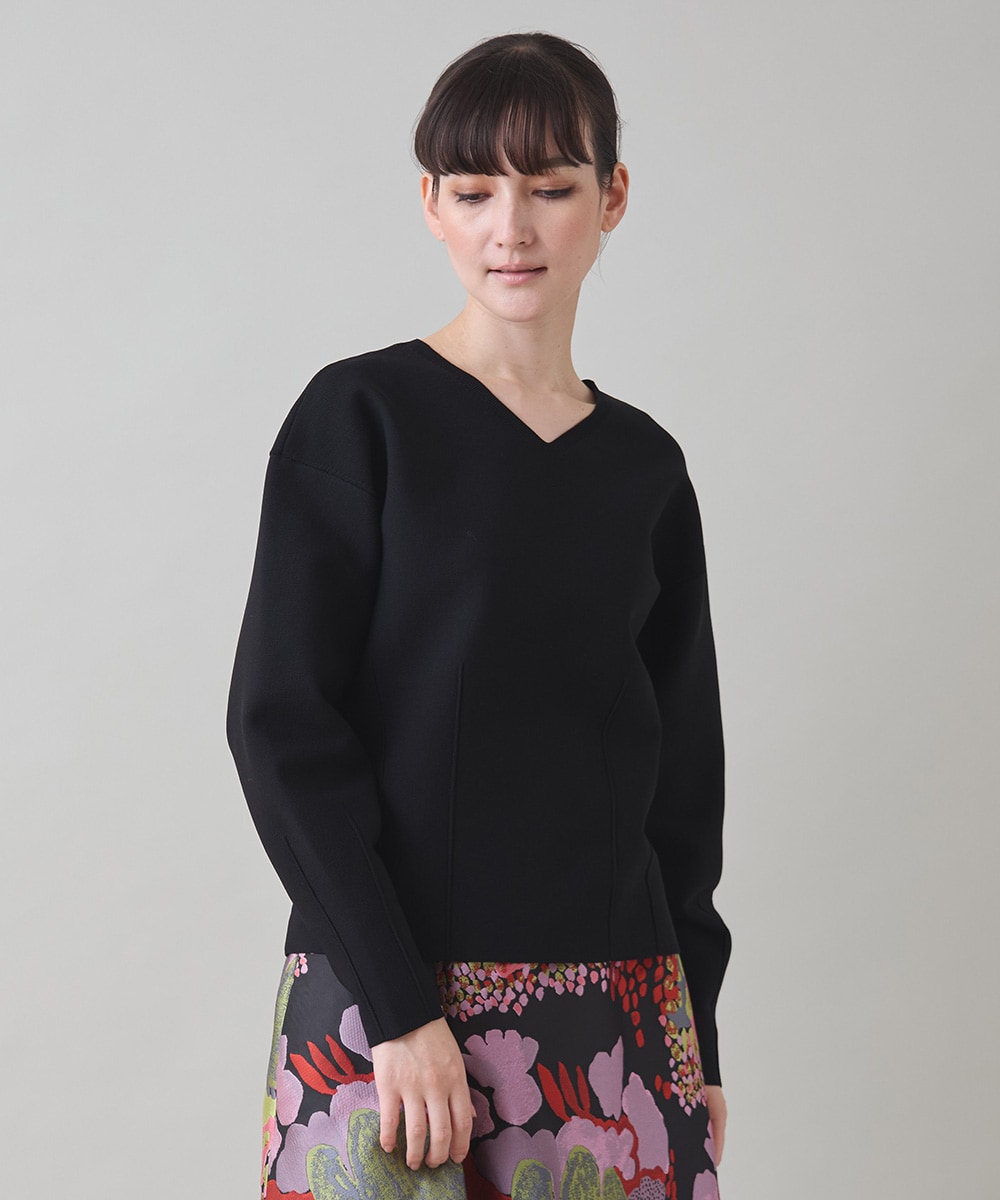ニットは型崩れしにくいポリエステルスパン糸のVネック。ほどよいゆとりのすっきり見えするフォルムです。体系が出にくくデザインされた型のまま着る事ができます。