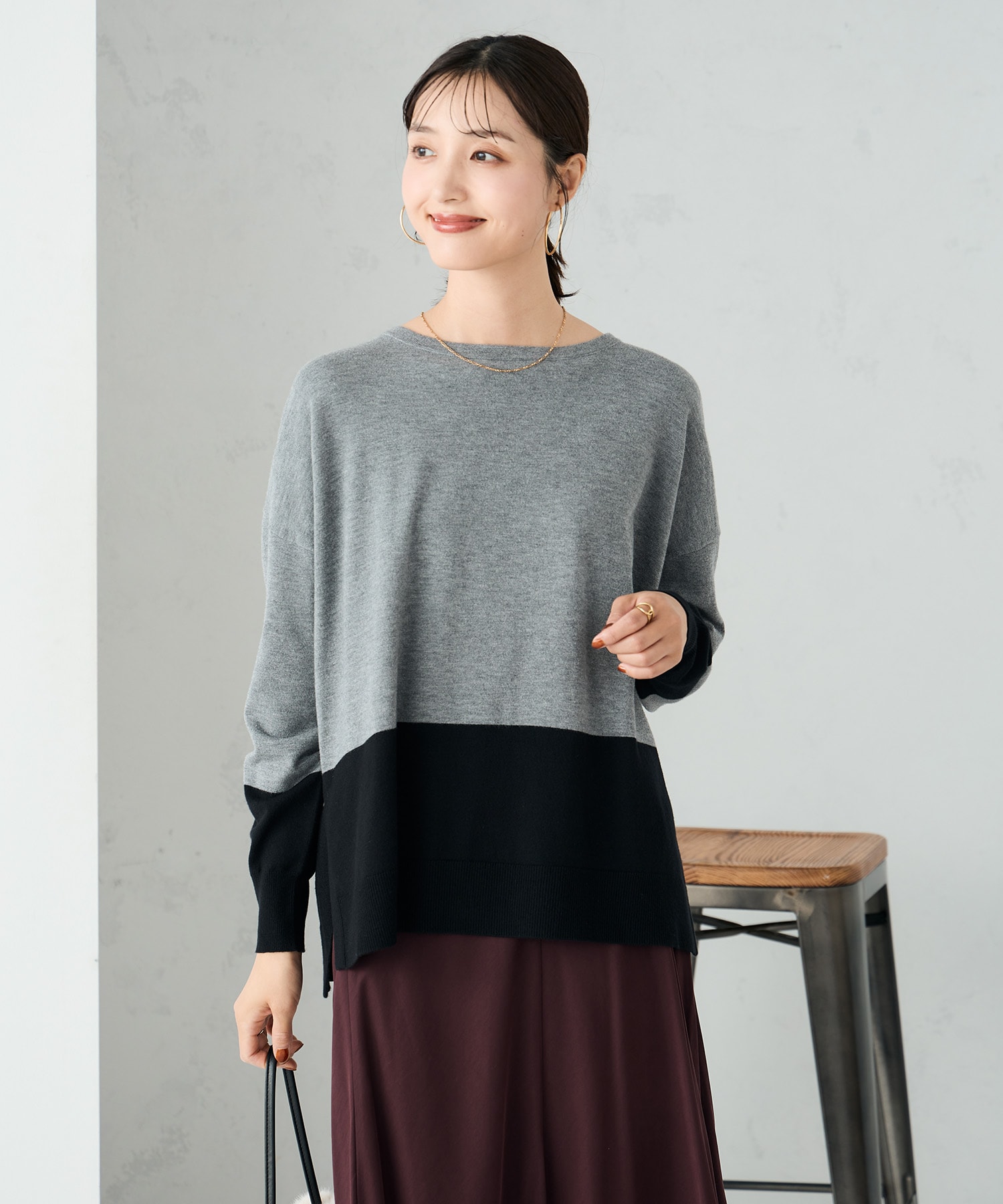 インナーのニットはバイカラーになっておりスタイルよく見えます。丈も長めでヒップまわりカバーしてくれます。