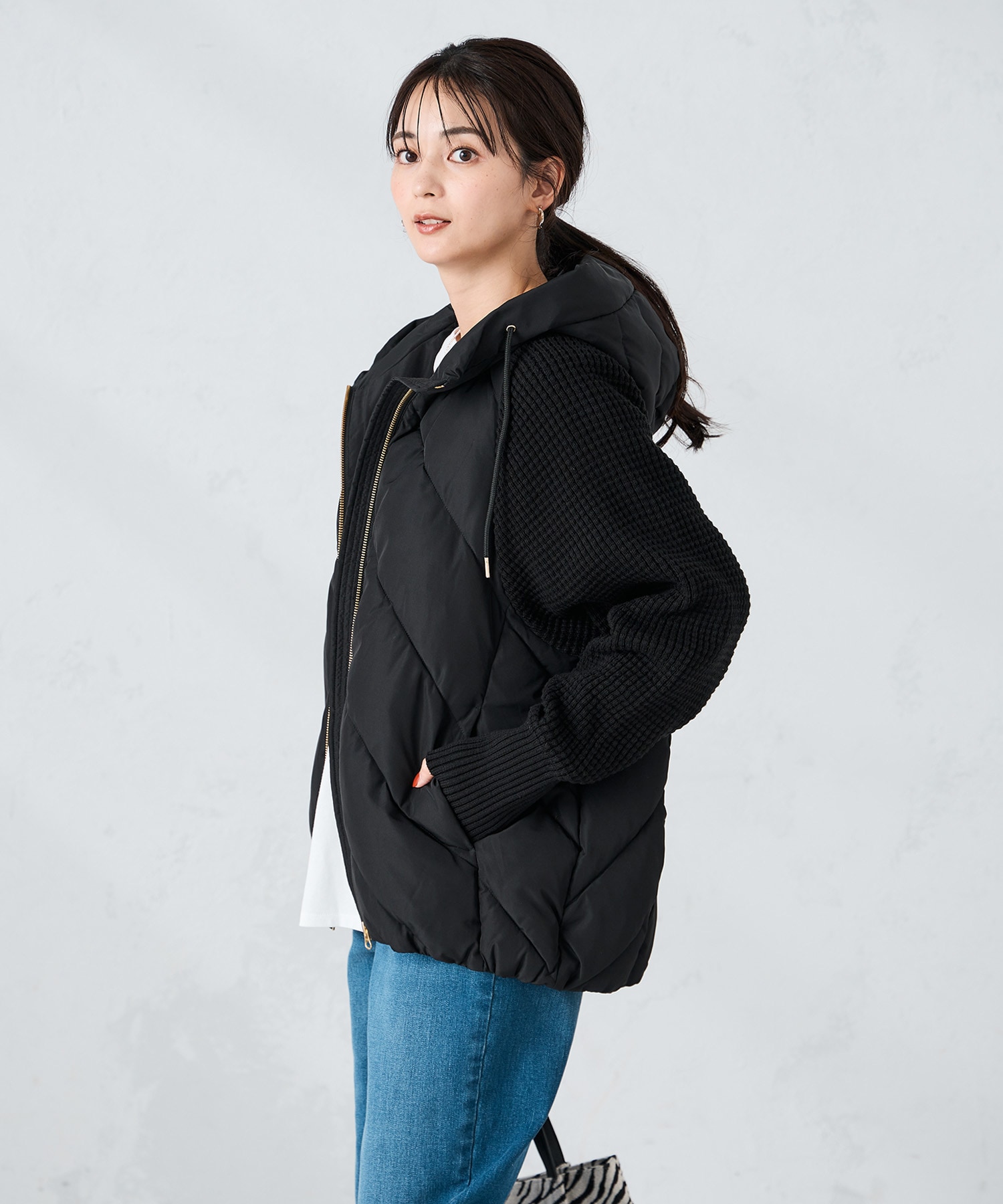 大人カジュアルコーデのご紹介です。こちらのアウターはお袖部分がニットドッキングになっておりとても可愛いです!中綿で保温性もありこれからの時期に重宝します。