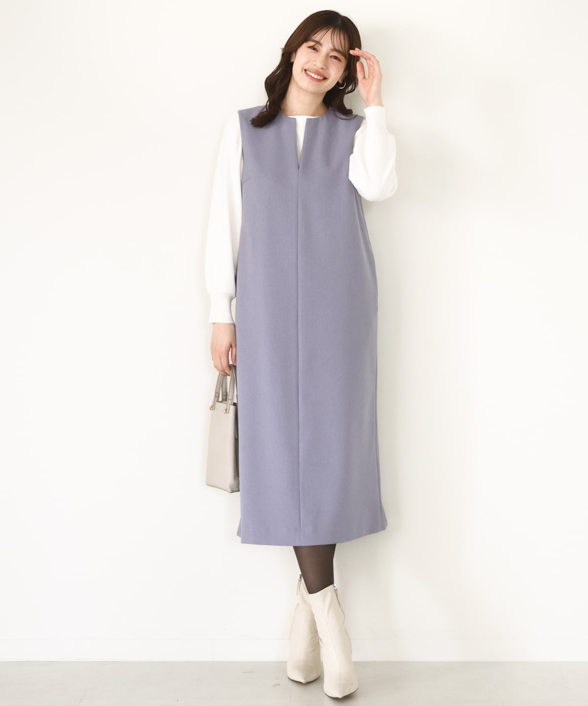 さらに、キーネックデザインジャンパースカートは、インナー次第で雰囲気を自在に変えられ、すっきりとした顔周りとシルエットで、細見えや楽ちんコーデを追求。