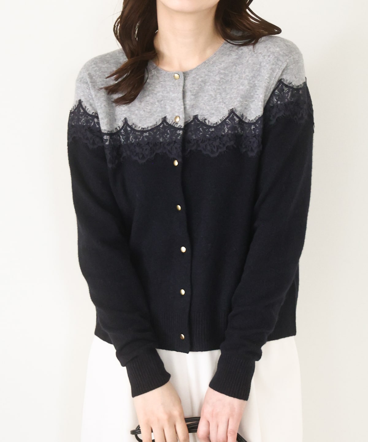 スカラップレース配色ニットカーディガンは、ヨーク部分の配色と繊細なレースの組み合わせが一枚で着映えを叶え、着痩せ効果や体型カバーも叶えます。