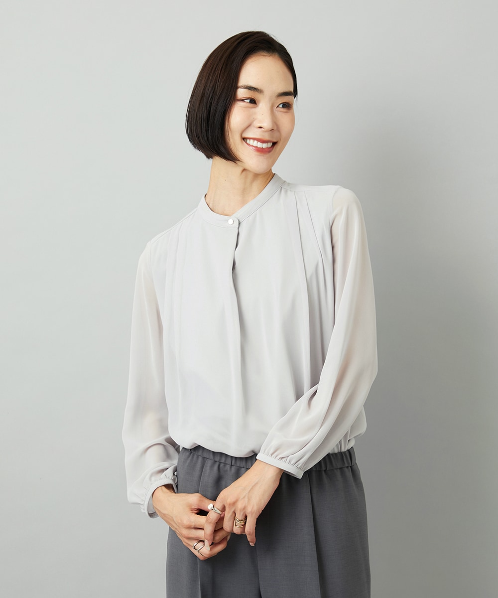 表はシフォンのブラウス素材で身頃の内側はカットソー付きで透けも安心な1枚着。