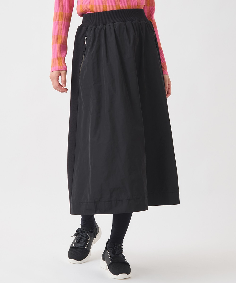 さらに、異素材ジョイントニットスカートは、光沢タフタとニットのコントラストがエレガントで、歩くたびに女性らしさを演出。