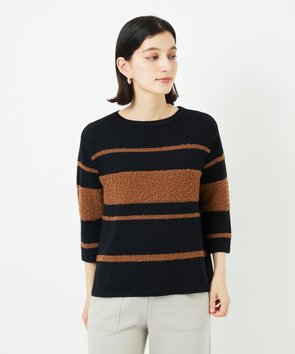 テディベアみたいなモコモコが楽しい七分袖ニットです。 黒部分は意外に薄手なので、長いシーズン着られます。 タフタのバルーンスカートに合わせました。 足元はスニーカーかブーツがバランス良いようです。 ※メゾン・ドゥ・サンクのジョルジュ・レッシュの36サイズを着用しています スカートはヒロコ・ビスの7号サイズです。 レギュラーサイズのご用意もございます。