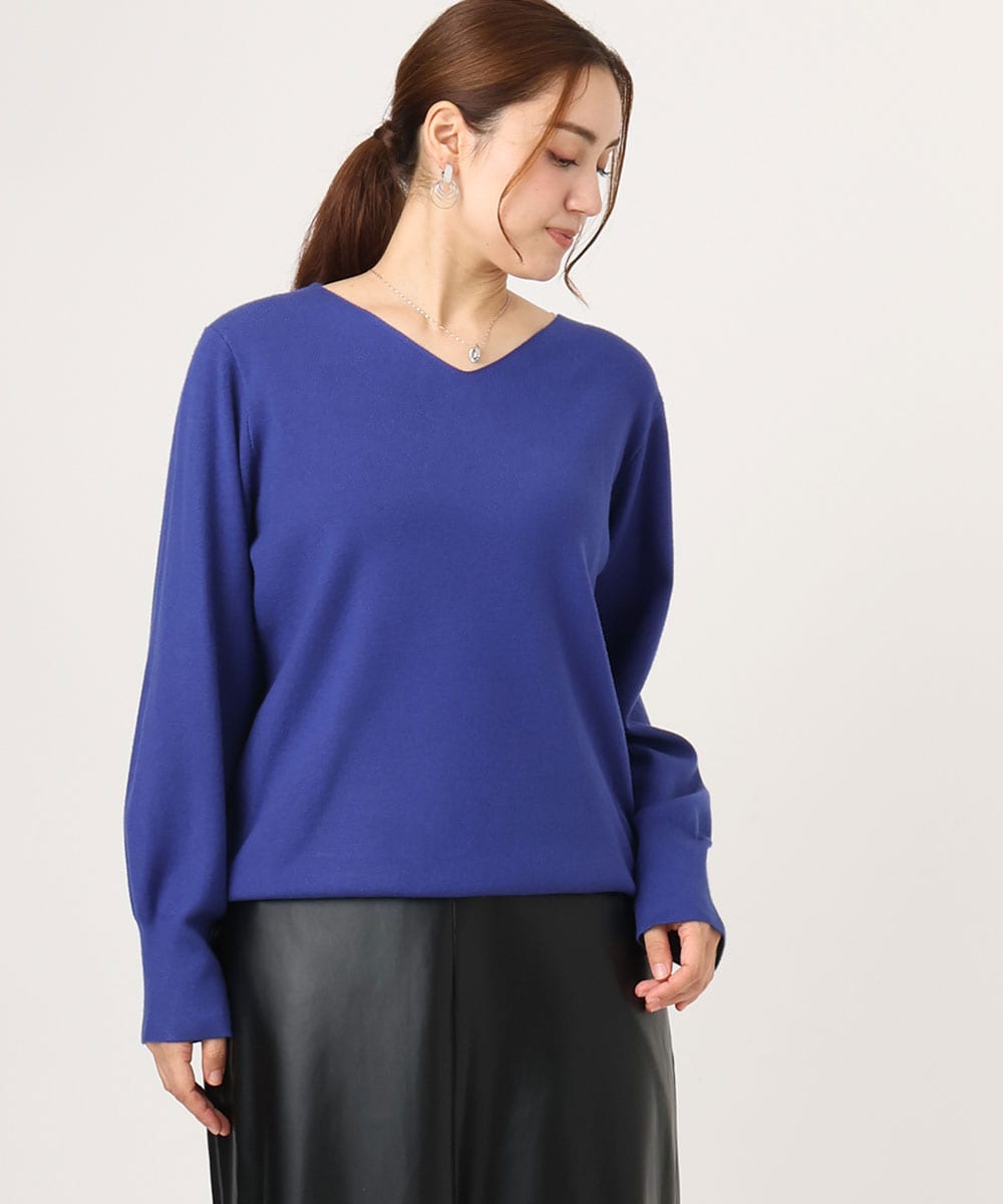 Vネックラインで顔まわりすっきり見えのデザイン。