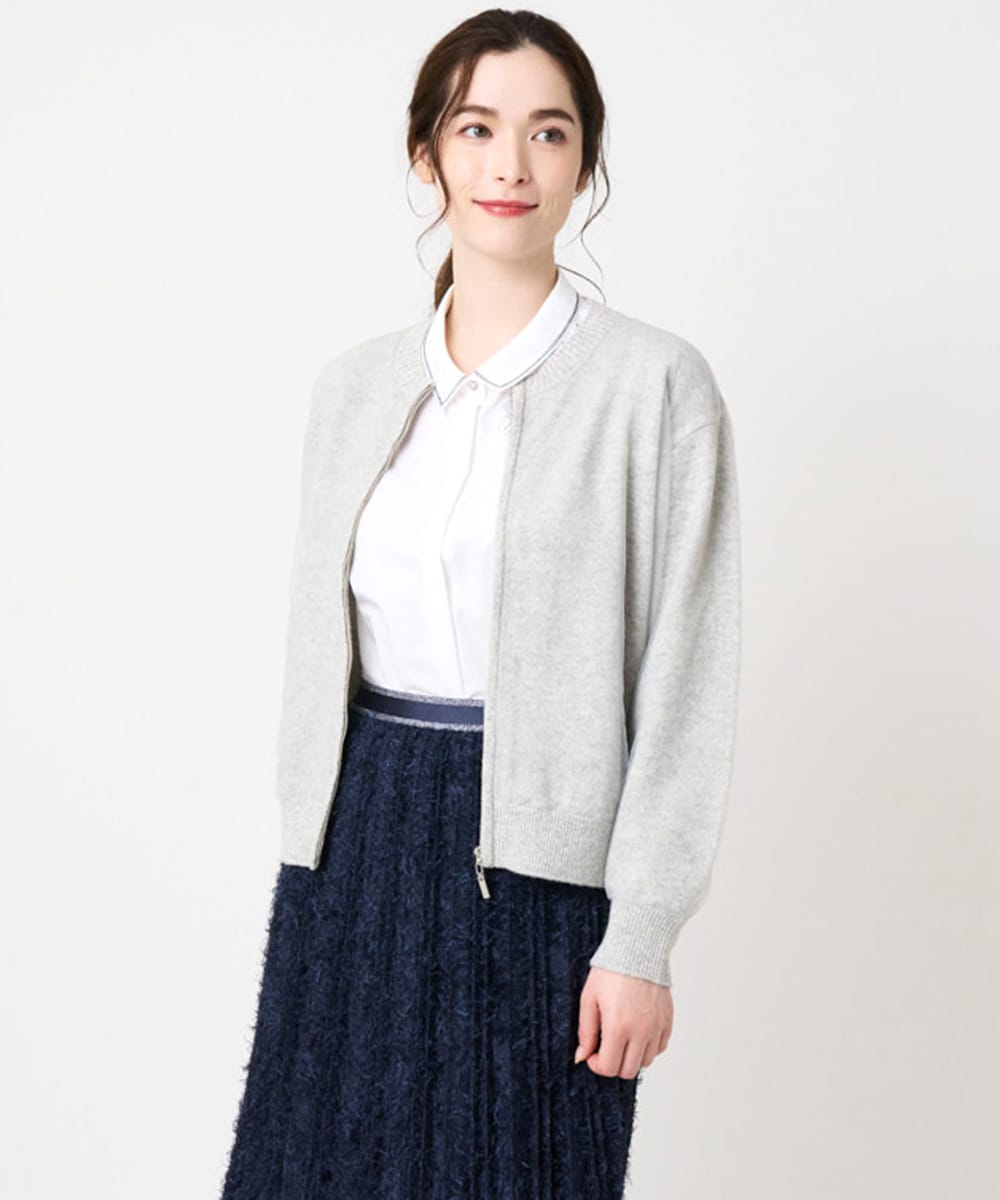 やや毛足のあるニットにさり気なくチュールで覆ったブルゾンタイプのアウターです。暖かくふんわりした肌ざわり。ウールコートやダウンコートの手前まで着られそうです。