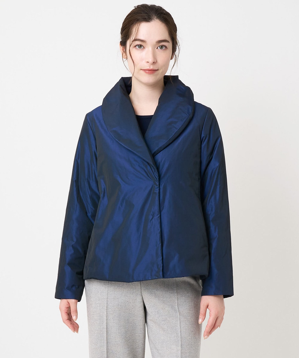玉虫色の美しい光沢と大きめなショールカラーが魅力的なアウターです。