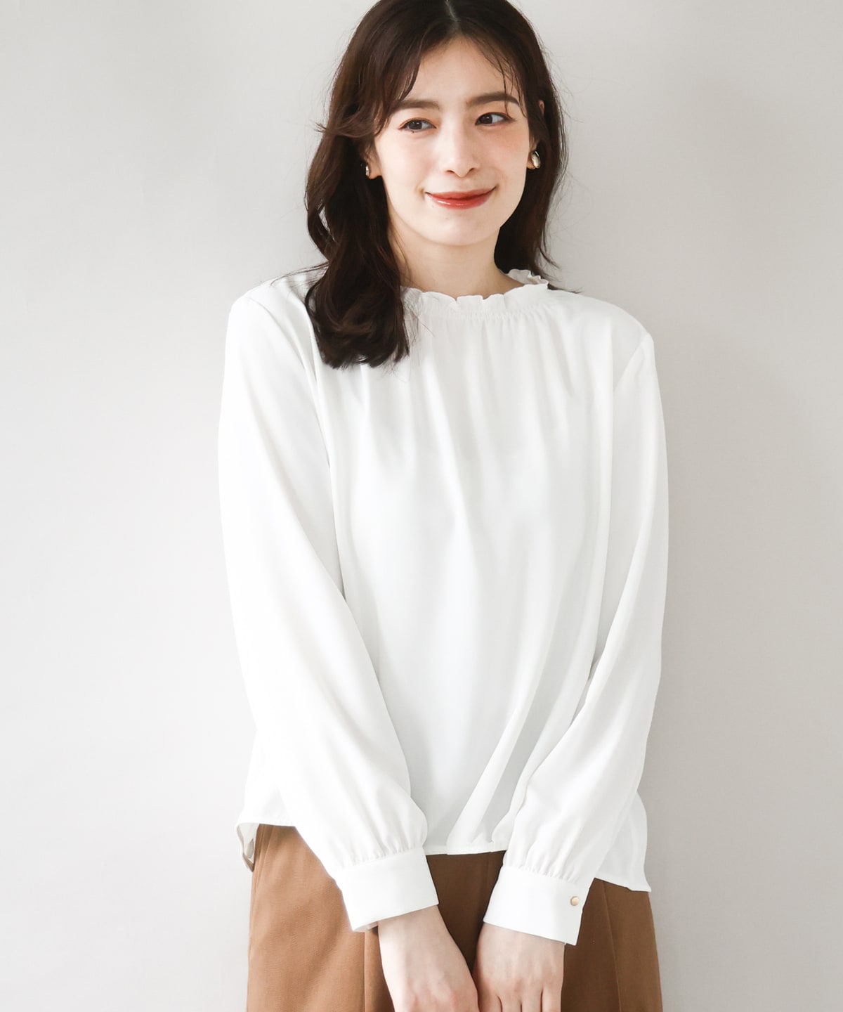 洗練されたデザインと優れた着回しやすさを兼ね備えたシャーリングネックデザインブラウスは、体に自然に沿う女性らしいシルエットを演出します。