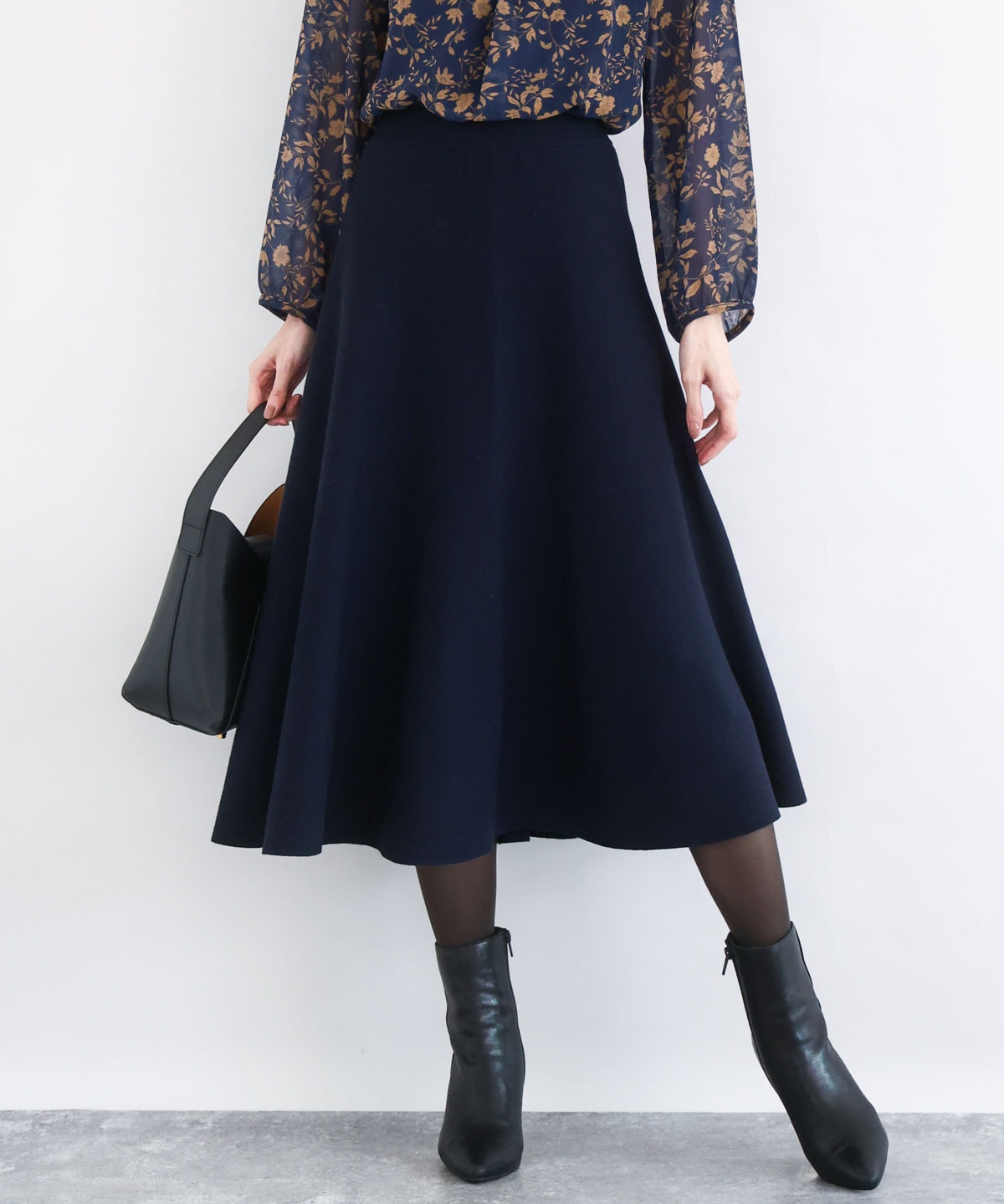 スムース編みバック釦ニットとニットフレアースカートのセットアップ。