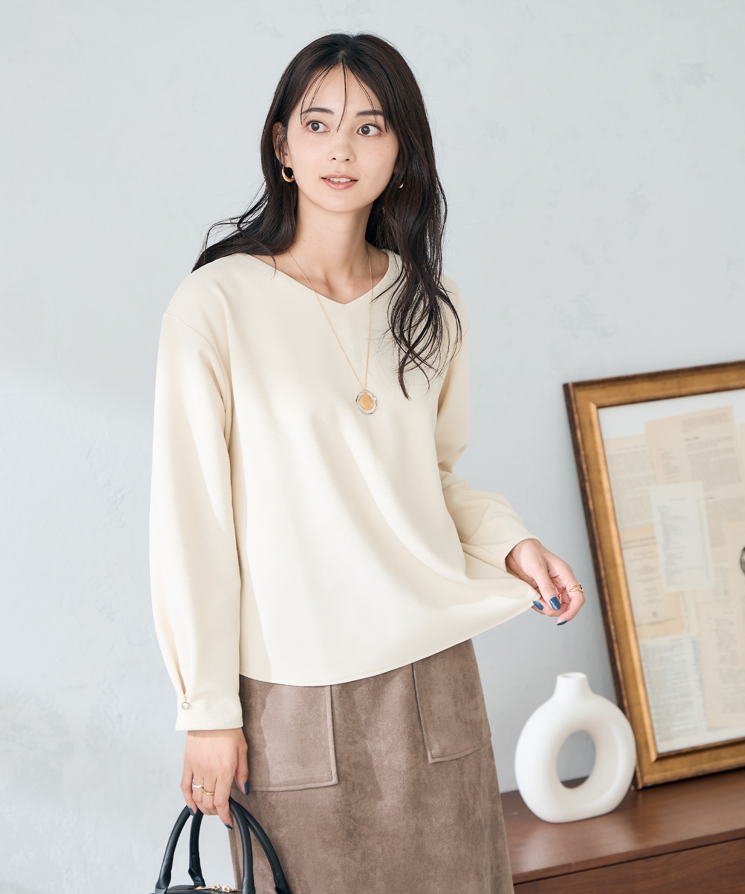 表面感のあるしっかりした素材のカットソーは、1枚着でもレイヤードでも楽しめます✨ 暑がりでまだニットはちょっと着たくないという方にとてもおすすめです♪