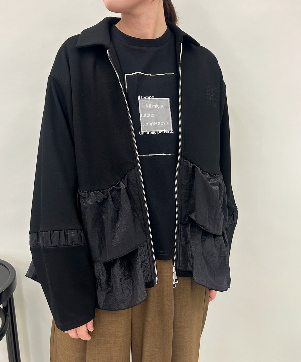 存在感抜群のライトブルゾンは モードにも決まる黒を着用。 弾力感のあるジャージー生地が着心地も抜群。 ツヤ感あるシアー生地を裾にジョイントしたバルーンヘムがトレンド感に、 裾にボリュームを持たせ、腰回りのカバーも◎ インナーにはすっきりとしたIラインシルエットのジャンパースカート◎ ダークグレーを着用。 ピンストライプ柄がマニッシュ感もあり甘くなり過ぎない‶ちょうどいい‶。 フロントジップはインナーに合わせて開閉、 裾は逆開ジップでスリットをお好みの長さにできるのも変化を楽しめるデザインです。 カットソーはコットン100%が嬉しい ナチュラルな生地で仕立てたロングTシャツ。 黒を着用。 キラリと光る□のメタルフレームに異素材や刺繍でコラージュロゴがアクセントを加えます。