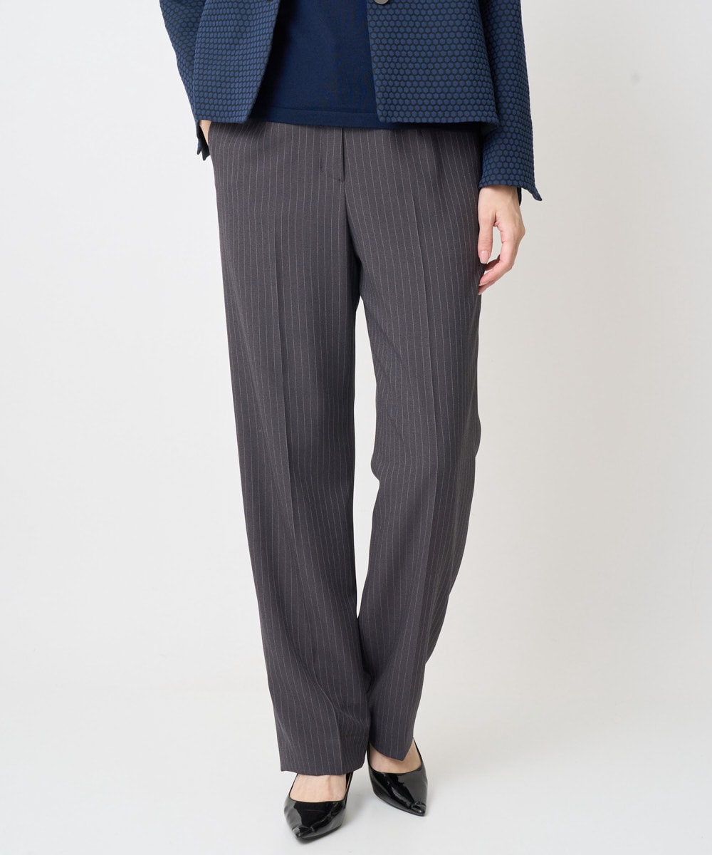 合わせるパンツには、モダンなストライプ柄のストレートパンツがおすすめ。
