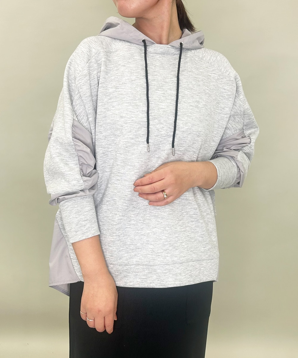ゆったりとしたシルエットにシャツライクな布帛生地を合わせたジョイントデザイン。