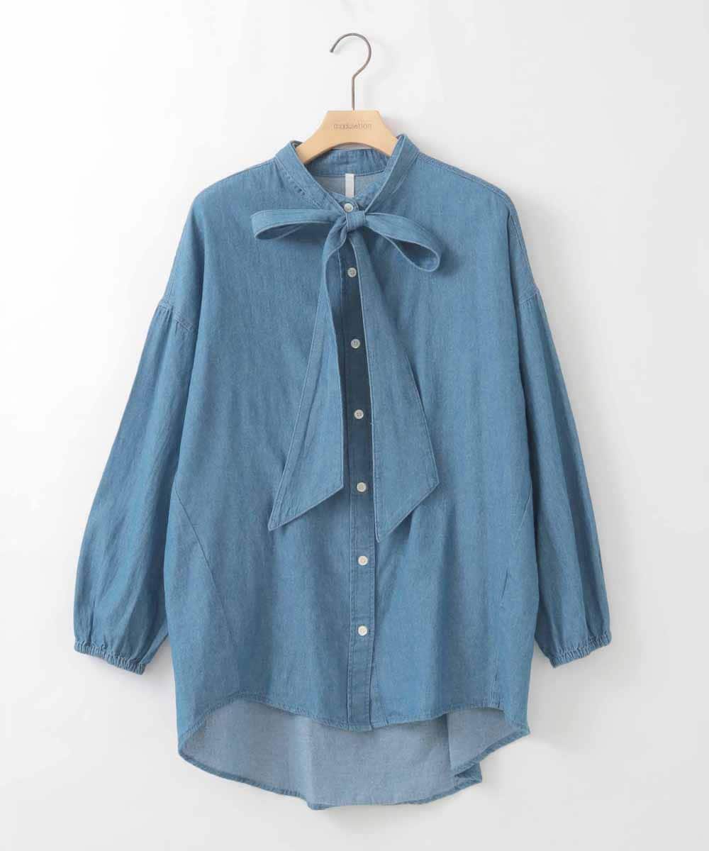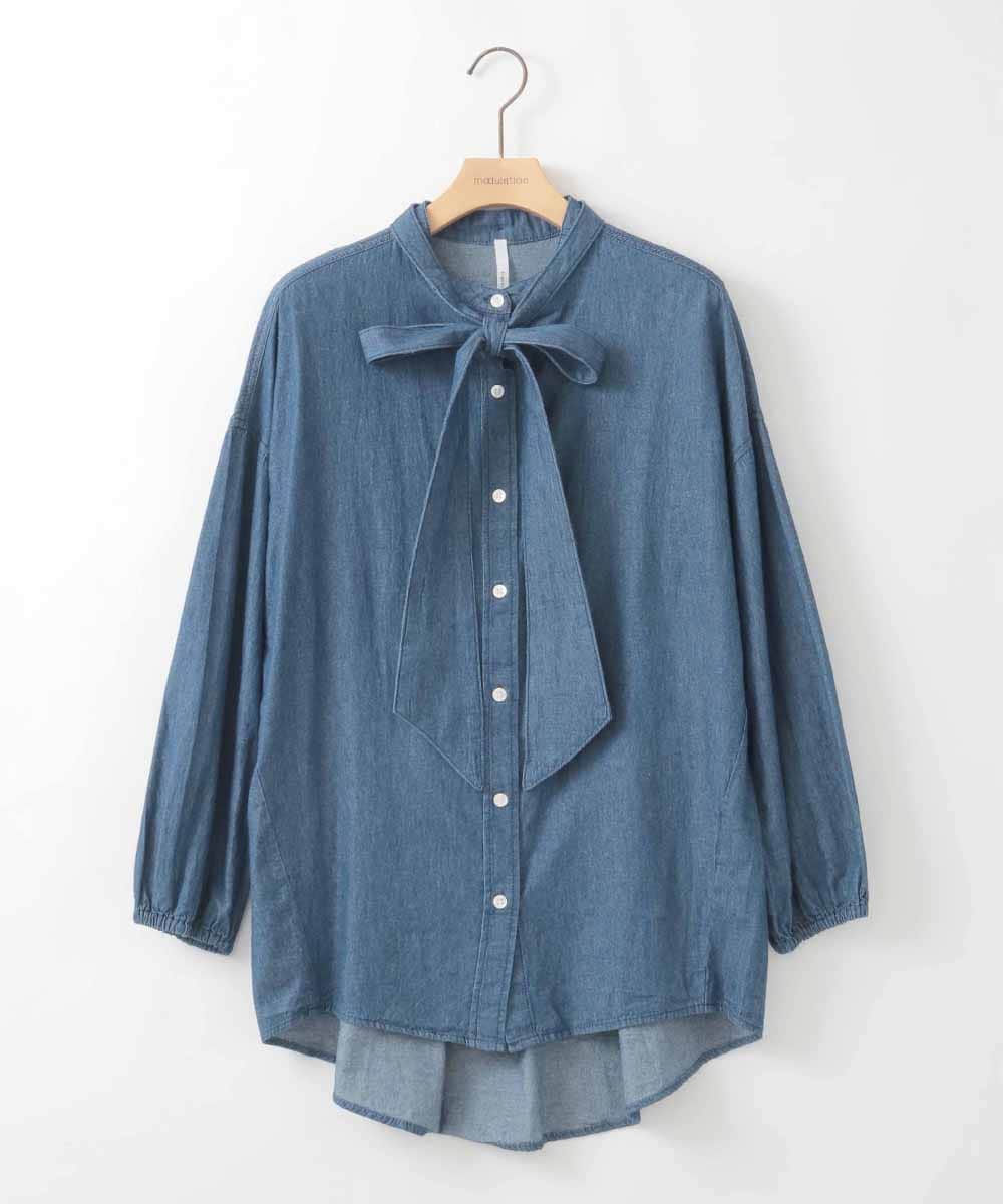 ライトで薄いデニムブラウスはボウタイは取り外しができ、