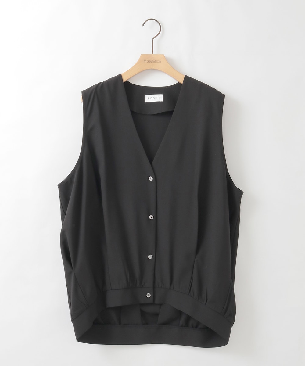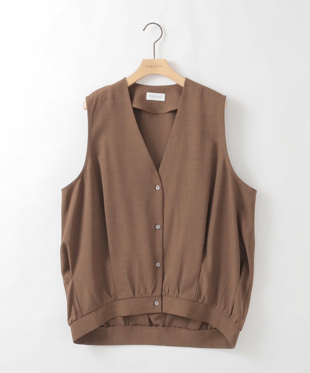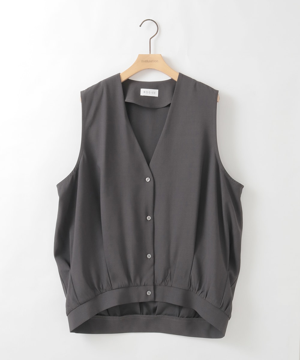 ベストは裾にタックを施したコクーンフォルムがこなれ感と、