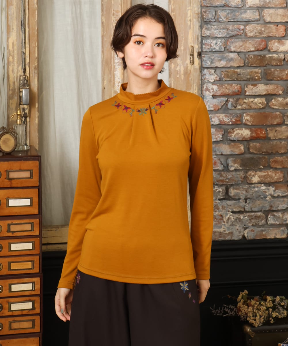 柔らかく肌触りの良いカットソーは、レイヤードや重ね着にも便利なすっきりシルエット。首元の刺繍と秋らしい色合いがおすすめポイント。