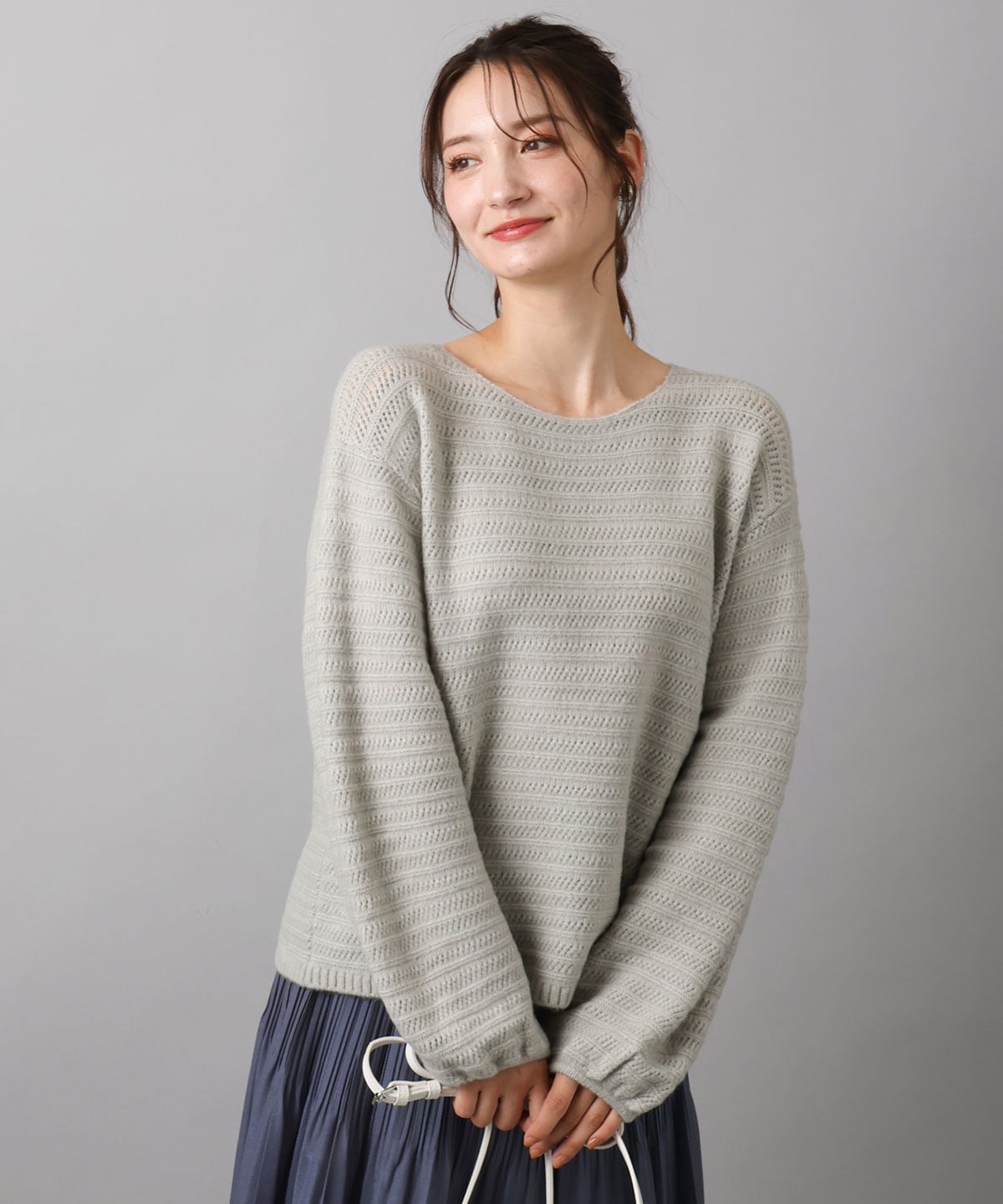 シアーボーダーボリュームパフスリーブニット☆ すっきりと見える衿ぐりと袖口のボリュームパフがデザインポイントのニット。程よいゆとりが嬉しいサイズ感です。メッシュボーダーなので無地ながら着映える一枚。寒い時期もふんわり暖かく着られるニットです! 起毛サテンガウチョパンツ☆ 色違いで持っていたいMK定番人気のパンツ。ウエストはゴム仕様なので履いていてとても楽です。分量感がありながら下にすとんと落ちてくれるので、スッキリ見えが叶うスカート見えパンツです。適度な光沢感があるので、大人っぽく履いていただけるところも素敵でオススメです!(裏地付き)