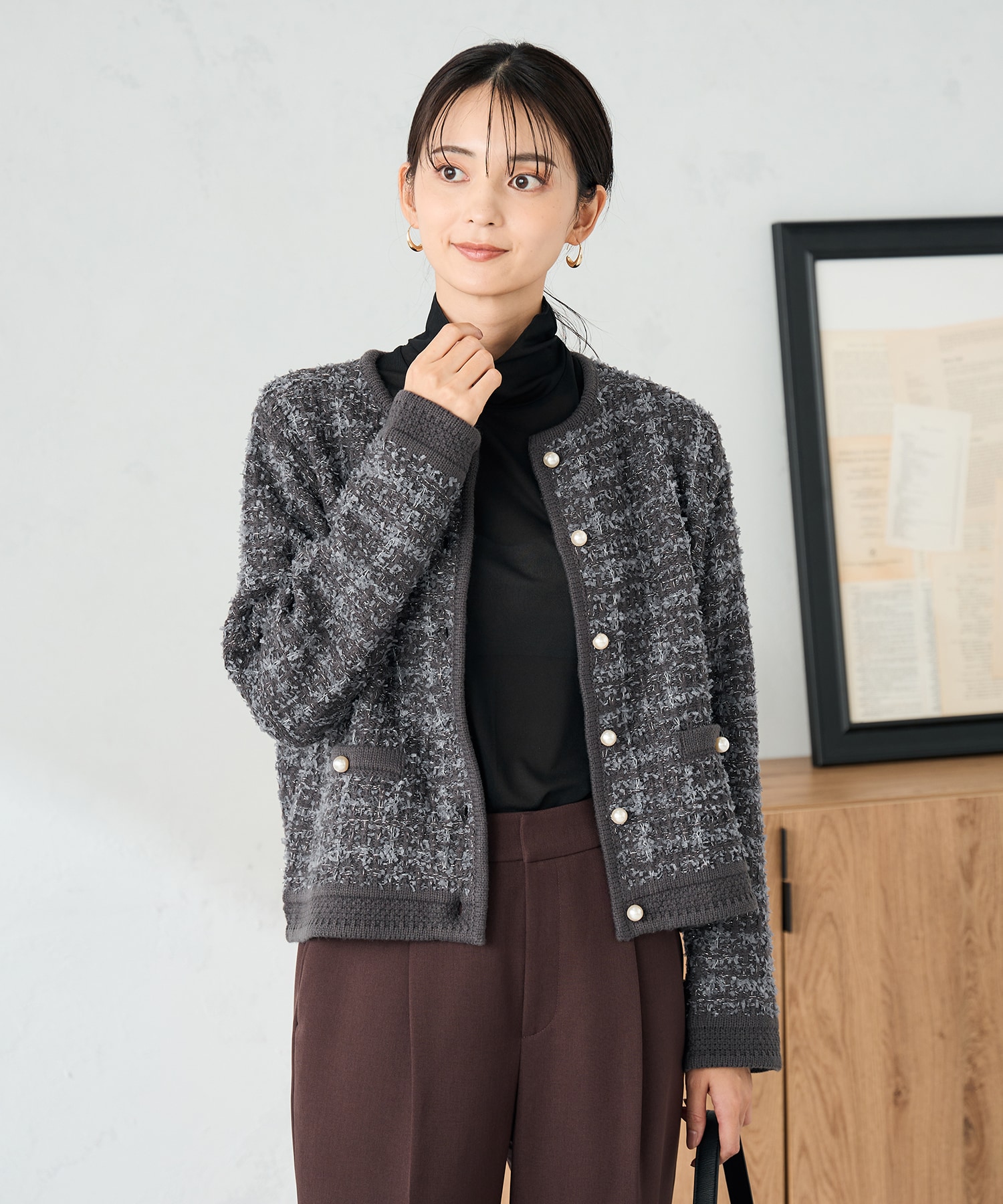 パールボタンツイードニットカーディガン