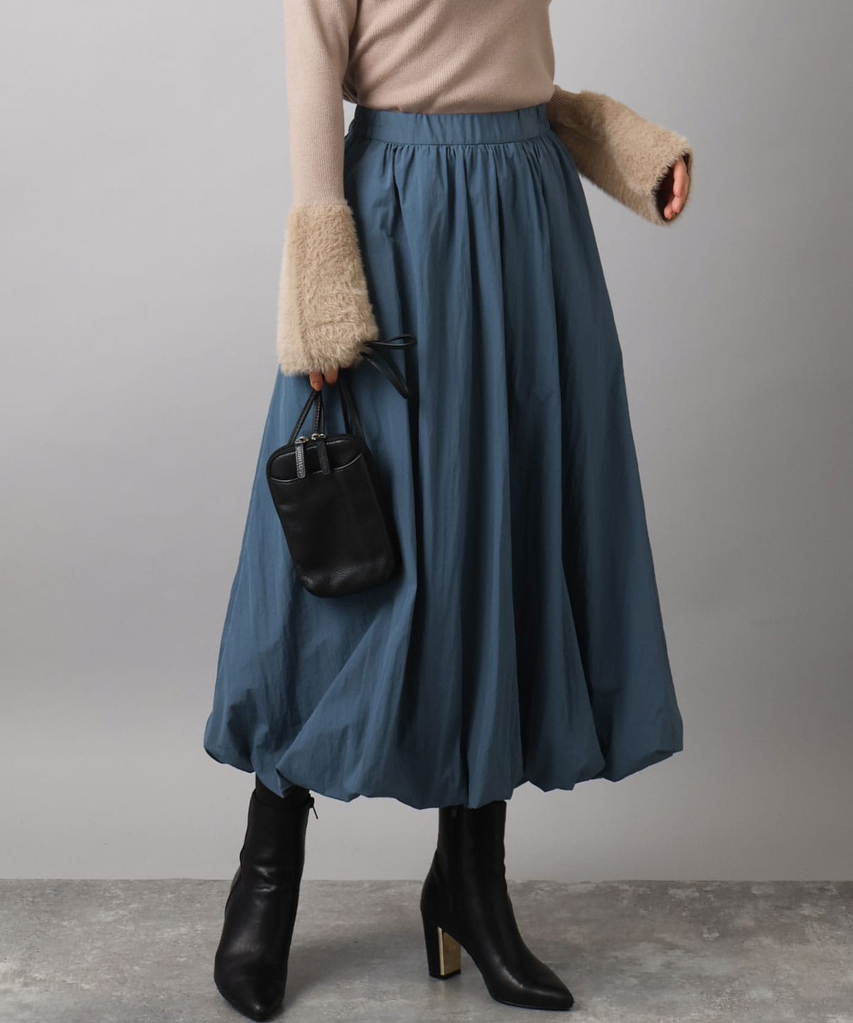 大人っぽいくすみブルーのバルーンスカートはウエストゴムではきやすくて丈感も長すぎないデザイン
