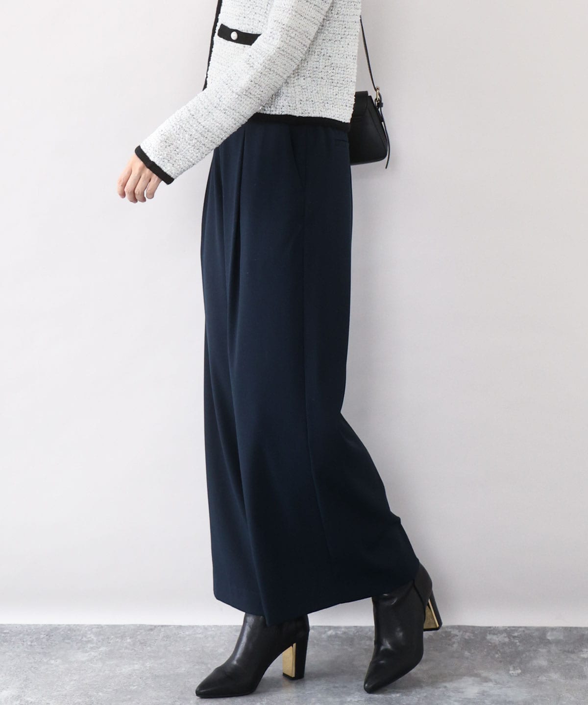 前部分にタックが取ってあり、広がり過ぎないワイドシルエット。ウエスト後ろゴムでファスナーなし。合わせるトップスでカジュアルにもエレガントにもなります。