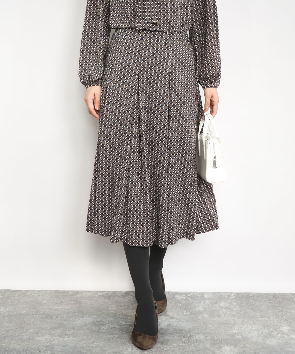 【フェザーニットカーディガン/洗える】 思わず触りたくなるふわふわシャギー素材が心地いい シーズンムードを高めてくれるシャギーニットカーディガン。Wフェイスの編地で垂れ感と型崩れを軽減してくれます。何にでも合わせやすいベーシックな形とコンパクトな丈感。 薄手でソフトな肉感に仕上げたシャギーニット。毛足も長すぎず、ふわふわとした肌触りの良さも魅力◎ 【スクエア幾何柄ボウタイカットソー/洗える】 ボウタイがポイントになったブラウス見えするジャージー素材のカットソーです。 着心地が良くジャケットインにもすっきり着られる為、オンシーンやきちんと感が必要な装いにおすすめです。 伸縮性がありシワにもなりづらくイージーケアで着られます。 【スクエア幾何柄フレアースカート/洗える】 シワになりにくくイージーケアでありながら伸縮性抜群のジャージー素材を使用。快適でいてストレスフリーな着心地ながらきちんと感がある優秀素材です。 やわらかなカットソー素材でいながらもきちんとした印象のスカートです。 ジャケット丈との相性が良くオンシーンでも活躍してくれます。 長すぎない着丈でお座敷での食事会やお稽古にも人気のスカートです。 セットアップでの着こなしがオススメです。