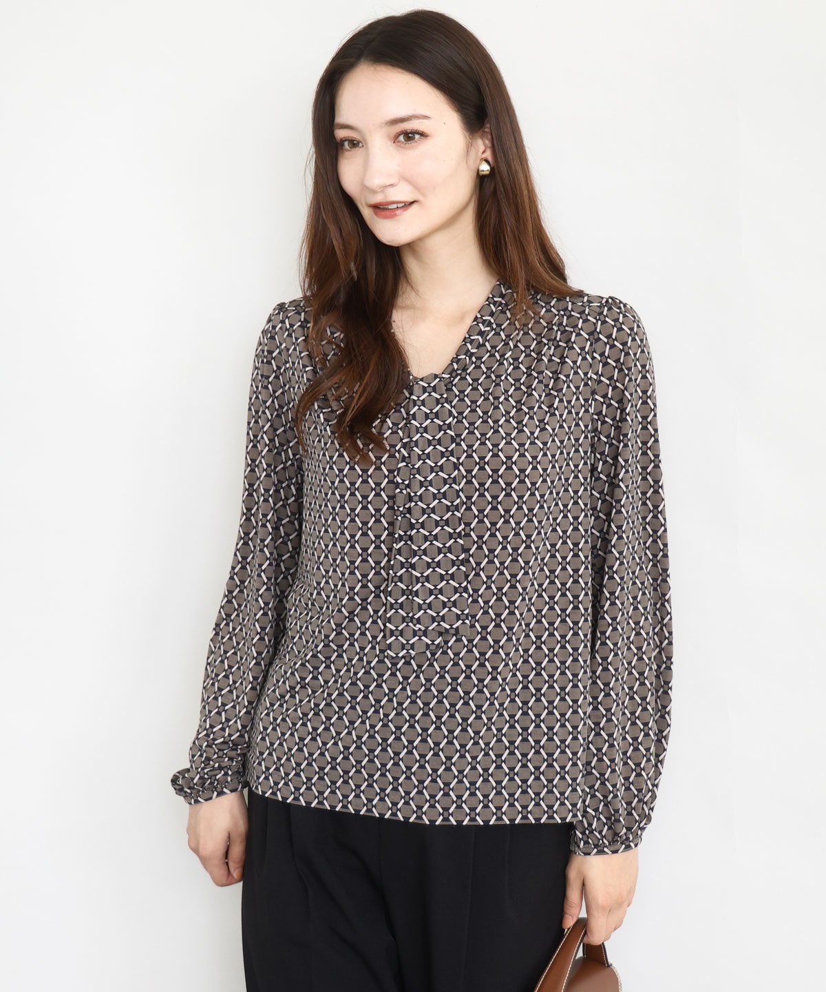 【スクエア幾何柄ボウタイカットソー/洗える】