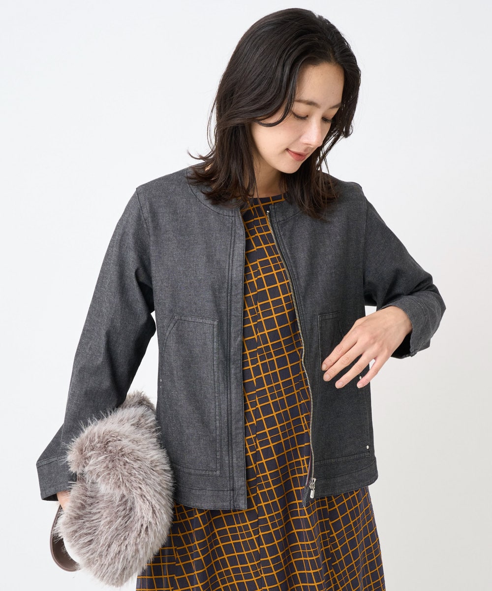 [セットアップ対応]ノーカラーブラックデニムブルゾン