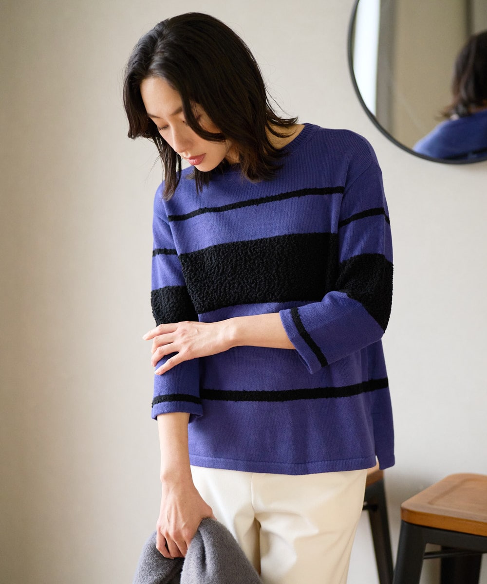 凹凸感のあるスラブボーダー8分袖ニットは、肌触りの良いコットンと立体的なボーダーパターンで、シンプルながらも新鮮な印象に。