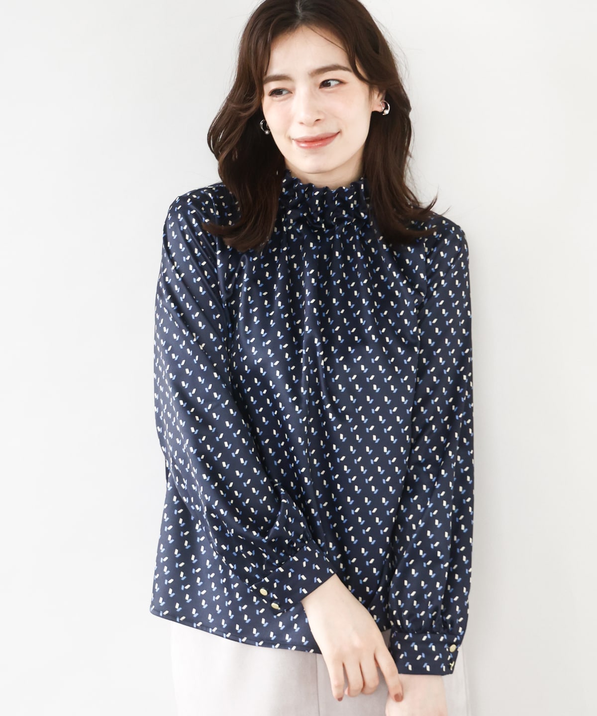 洗練された幾何柄スタンドネックブラウスは、首周りがすっきりと立ち上がるデザインで、エレガントさを演出します。