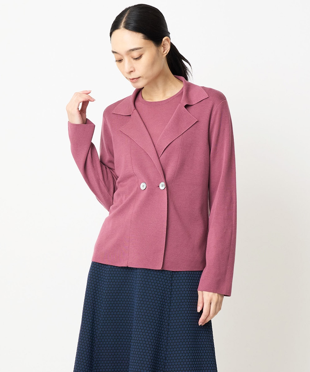 落ち着きのあるピンクに上品なジャガードスカートできれいめコーデに。