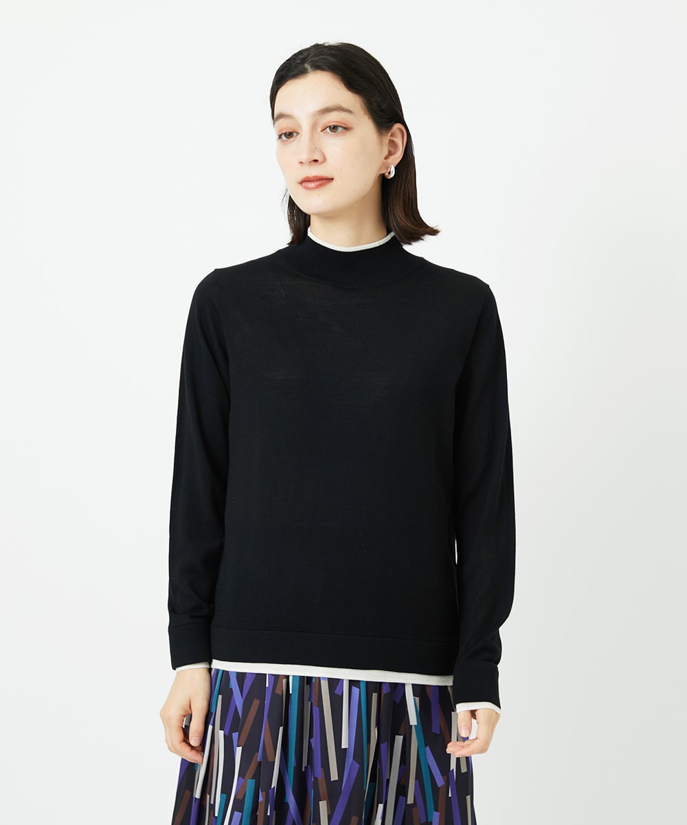 上質なウォッシャブルウールを使用したアンサンブル対応のハイネックニットは、体のラインを拾わず適度なゆとりのあるシルエットが魅力。