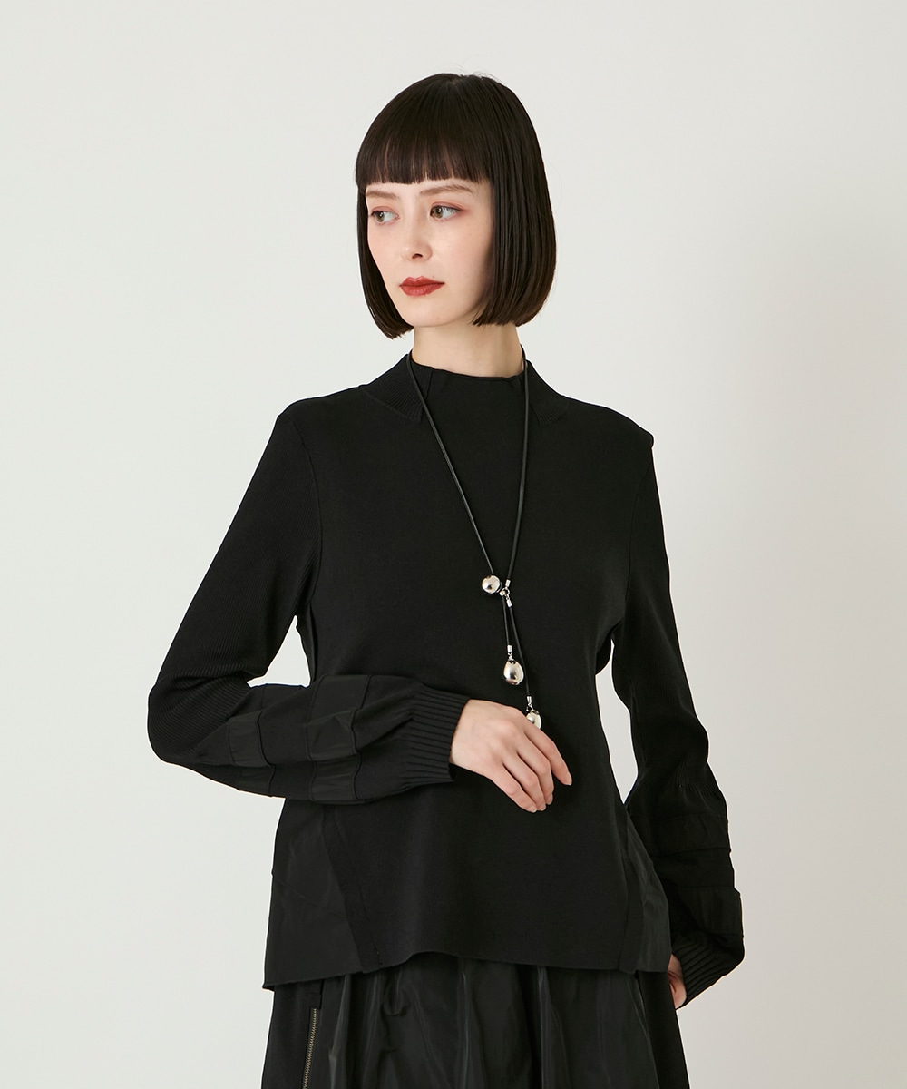 光沢のあるタフタ素材にニットを組み合わせ、見た目もオシャレな異素材ジョイントニットプルオーバーと特徴的な柄が目を惹くハート柄ドットプリントフレアスカートです。