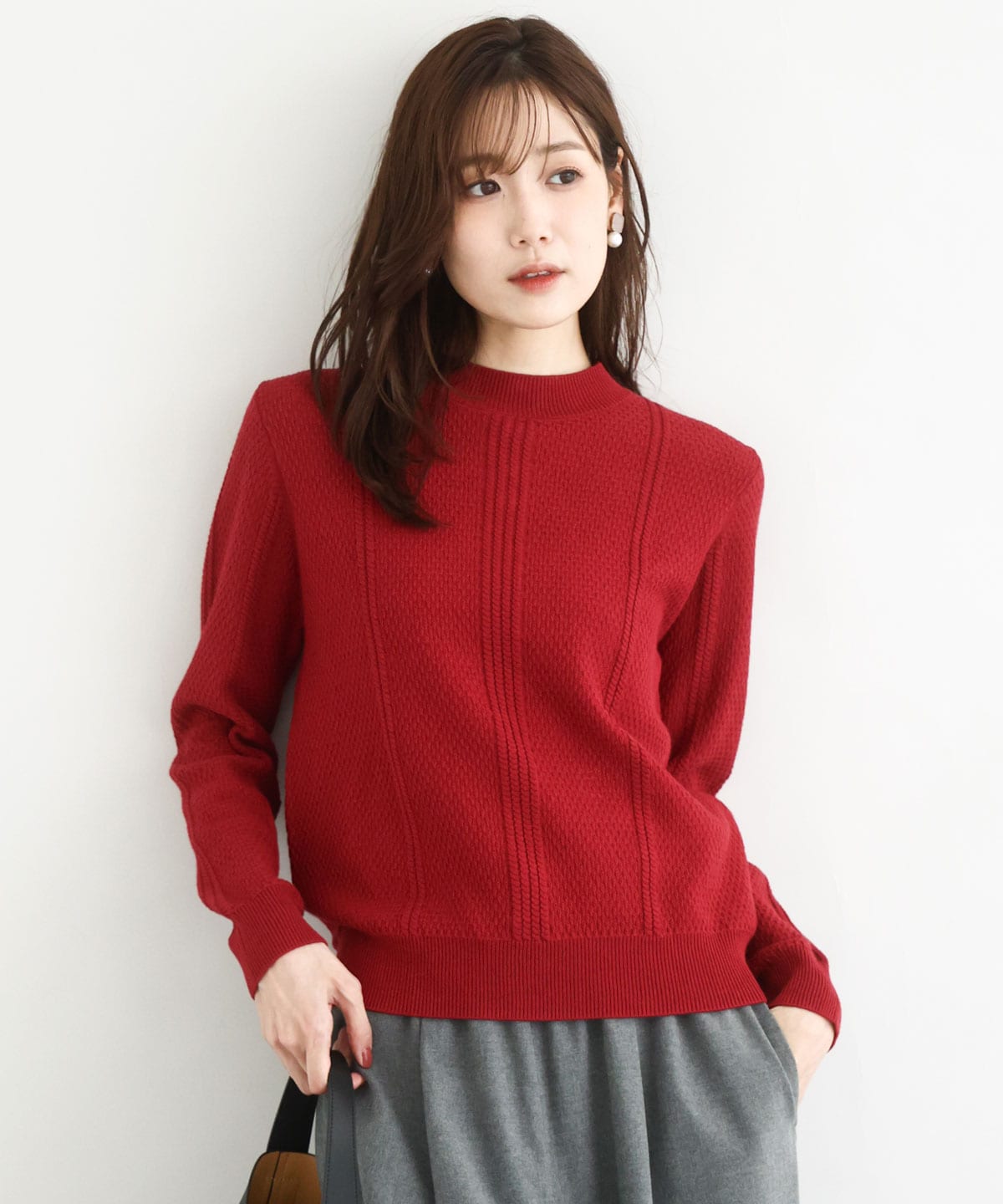 全体的に細かな地柄とミニケーブルが入った表面感のある編地がポイントのニット。