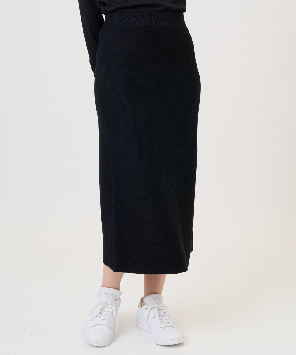 Iラインのニットスカートで全体をキュッと引き締めて、メリハリの効いたコーディネートに。