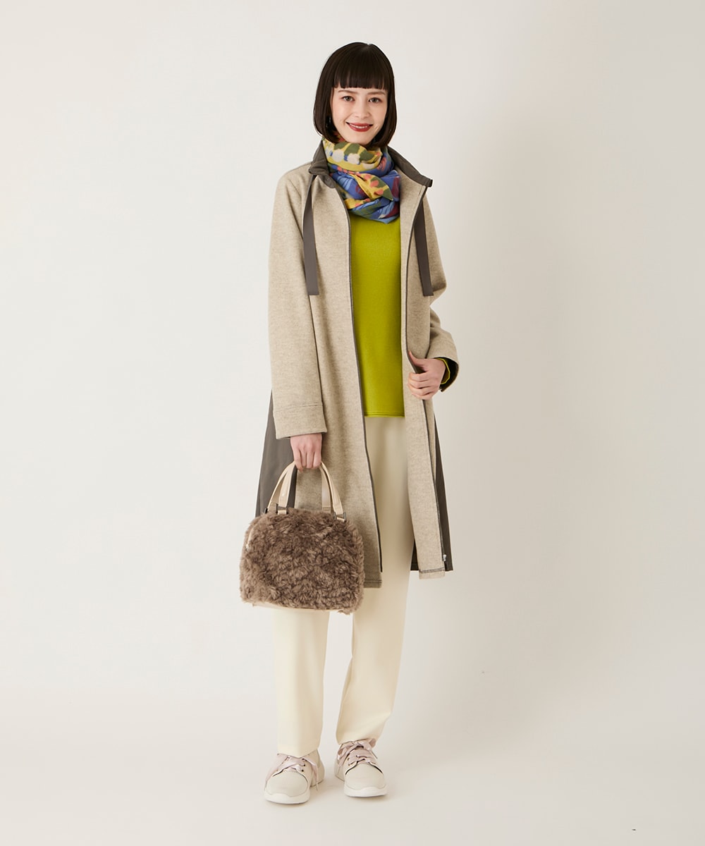 圧縮ウールのような風合いの素材とタフタの切り替えコートはサッと羽織れてスッキリ見えるデザインです。