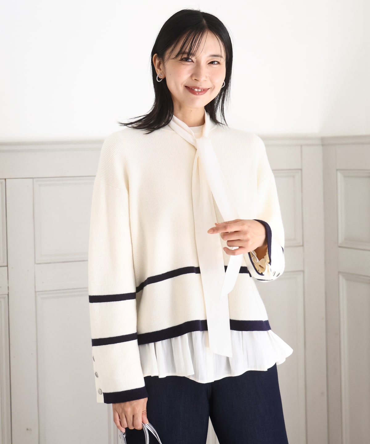 少し短め丸首ニットは肌触りが良くて暖かくてお袖と裾のボーダーのラインがポイント