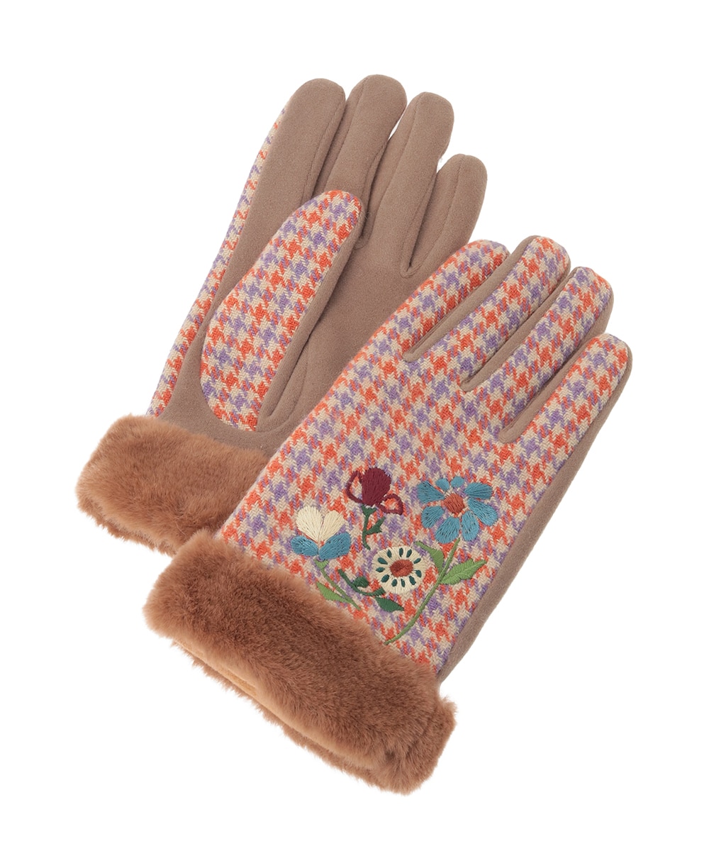 暖かなカラーの千鳥格子柄グローブ。手首周りにはふんわりとしたフェイクファーが施されており、フラワー刺繍がアクセントになっています。丁度良いサイズ感なので、プレゼントにもおすすめです。