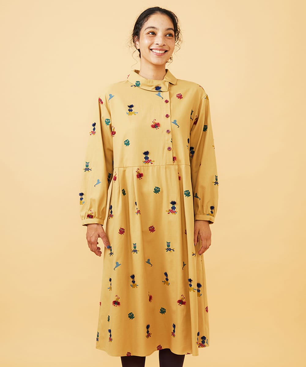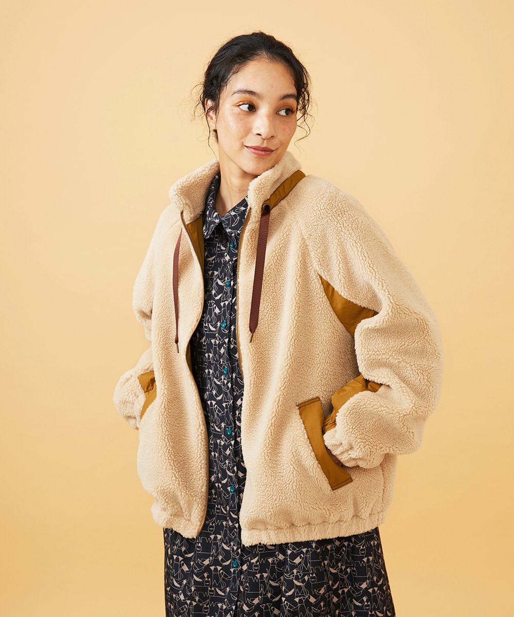 ふんわりとしたボア素材。優しい肌触りで裏地も付いているので、暖かく着用できます。後ろ首元にあるイヌ•ネコ•鳥の刺繍がポイント。