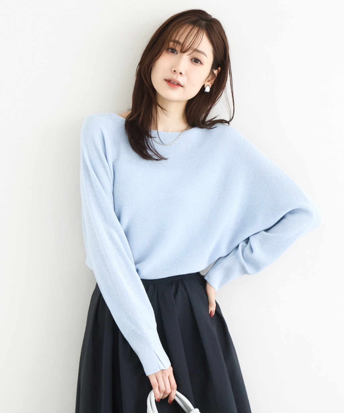 シンプルなデザインのドルマンスリーブニットですが、上品なラメが華やかで着映えします。