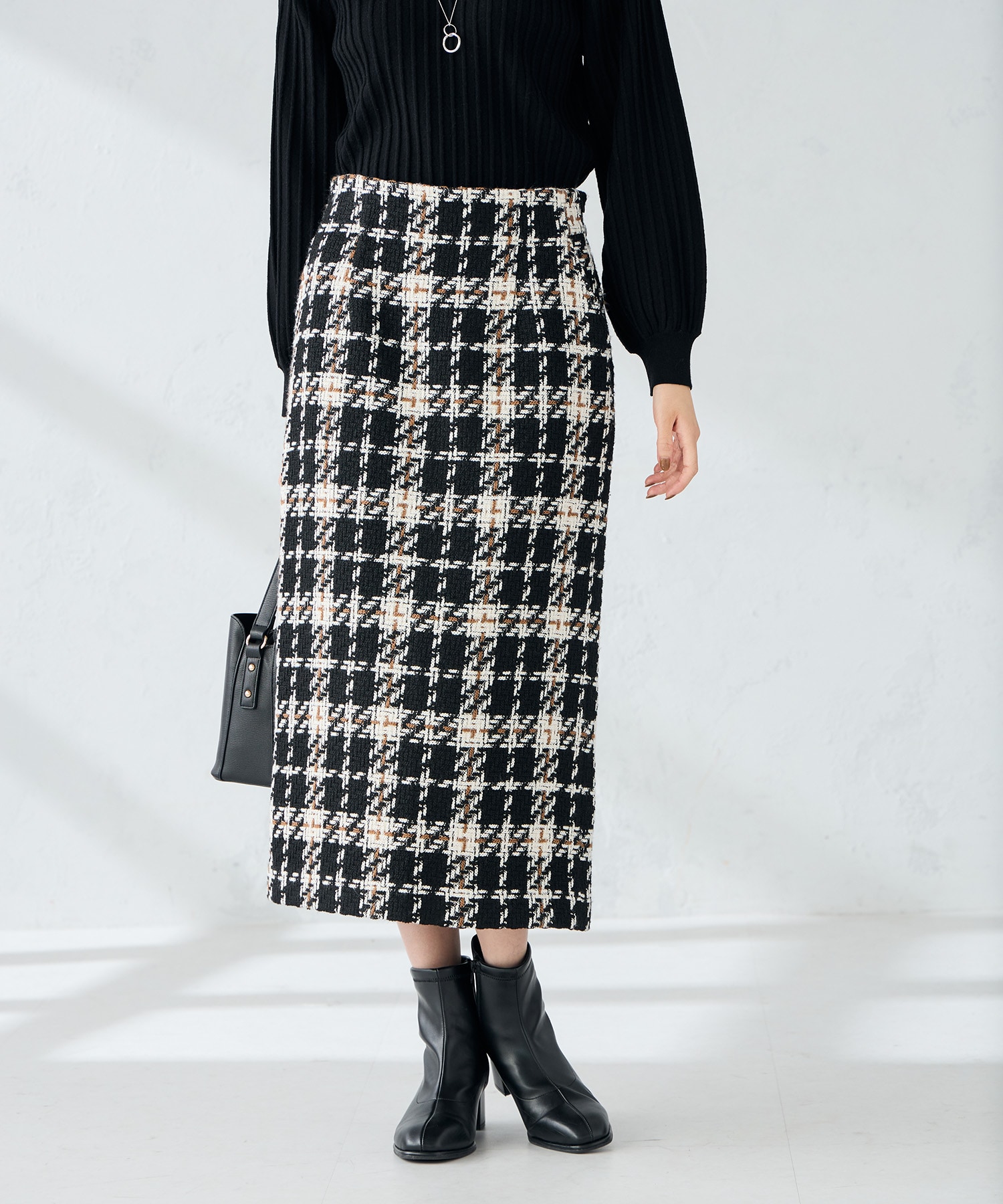 トレンドと上品さを両立するツイードチェックスカートはSサイズ着用でピッタリフィットですが生地がしっかりしているのでポッコリお腹カバーしてくれます