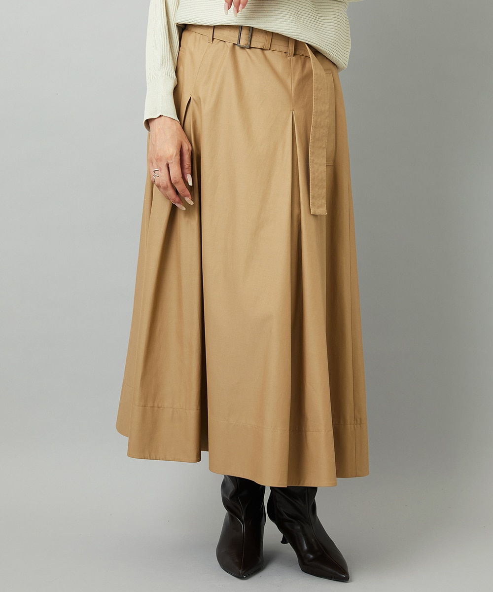 ベルト付きデザインで腰まわりはすっきり、裾に向かって自然に広がるAラインシルエットのスカート。