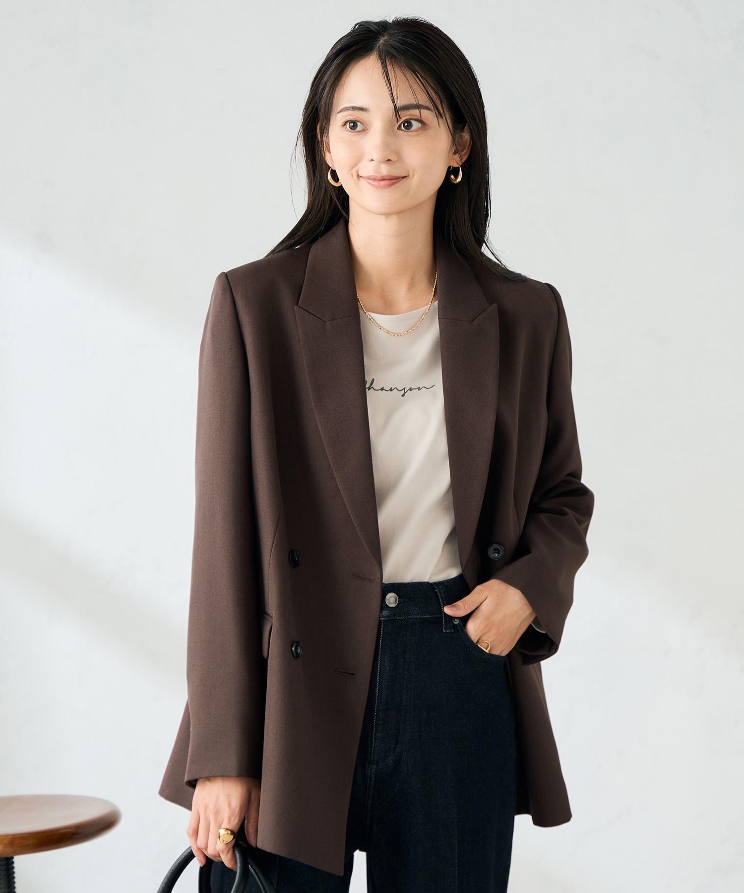 お仕事、セレモニーにも。一味違ったダブルのジャケットでオシャレ見えコーディネートです。