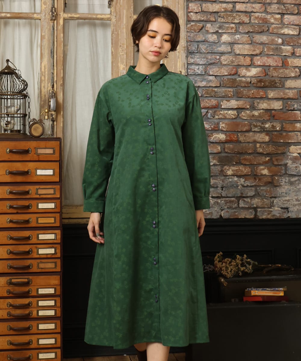 ワンピースは、コーデュロイのお花オパール加工。お花のポコポコ感がポイント。